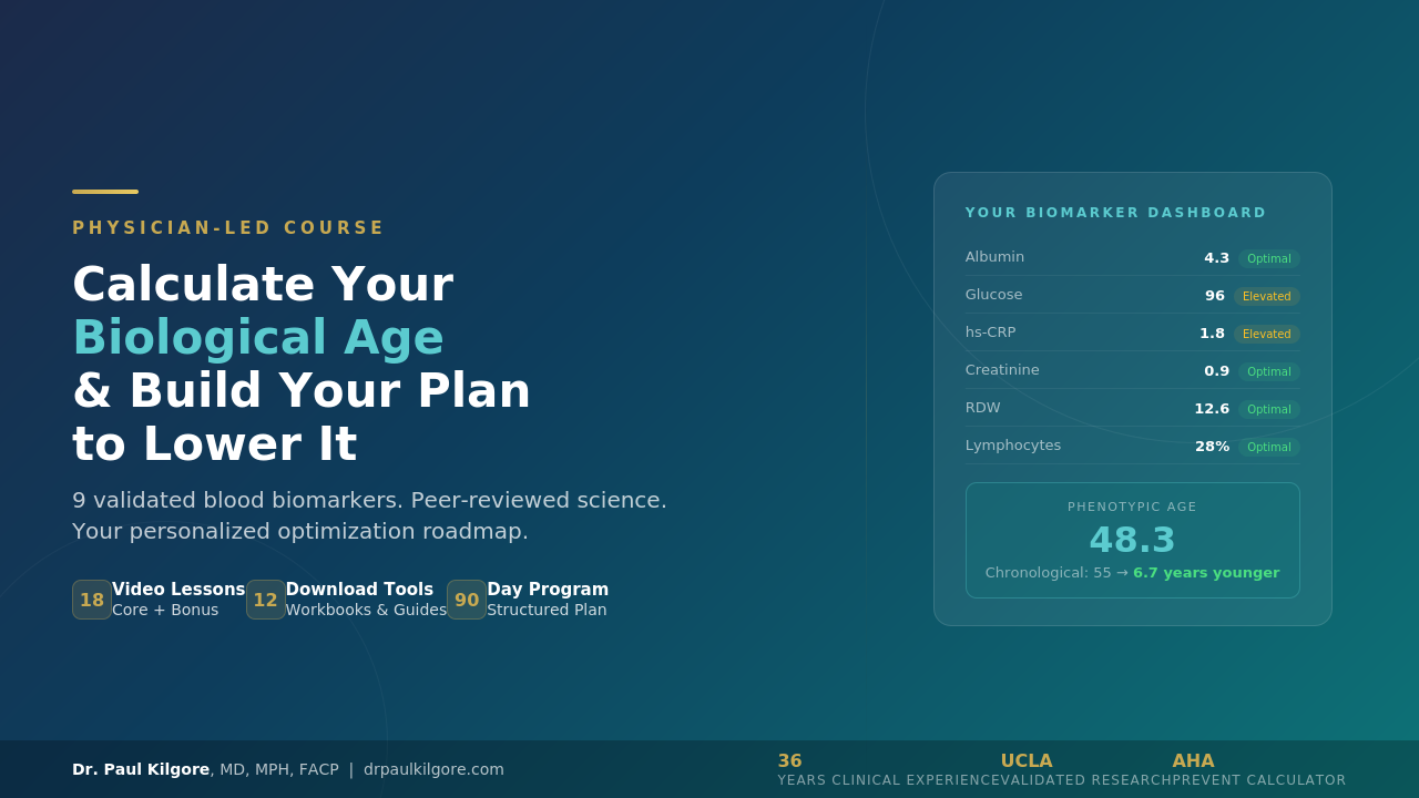 HEALTHY YOU: YOUR BLUEPRINT FOR A HEALTHIER YEAR ($299) — Go deeper. Calculate your Biological Age using the same validated UCLA formula used in research on 11,432 adults, then build a personalized plan to lower it. Includes 18 video lessons, your cardiovascular risk score using the AHA PREVENT calculator, a structured 90-day optimization program, and 12 downloadable tools — workbooks, meal plans, supplement guides, and more. Designed for anyone who wants a data-driven approach to healthier aging.